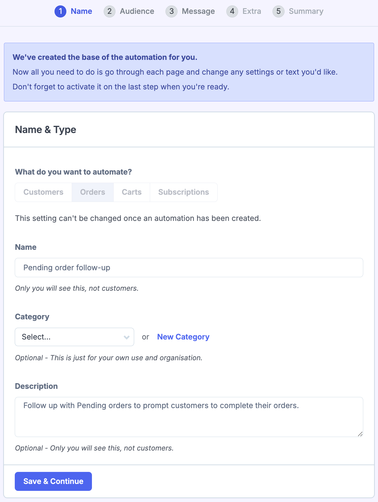 1. Create an orders automation - https://app.metorik.com/tools/engage/automations: