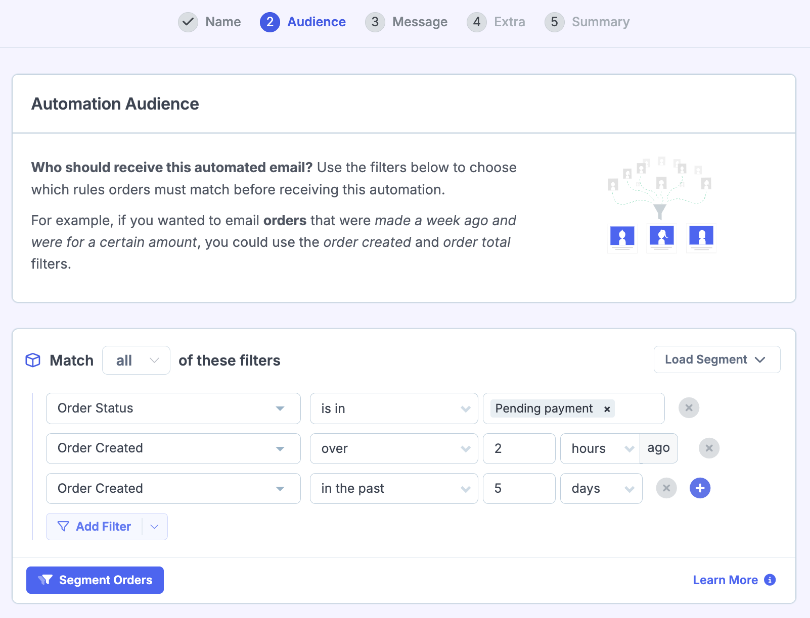 You will likely want to add a 'delay' so it sends a few hours after the order is pending. To do that, we've added a rule for 'order created over 2 hours ago', so it only sends a couple of hours after being created.