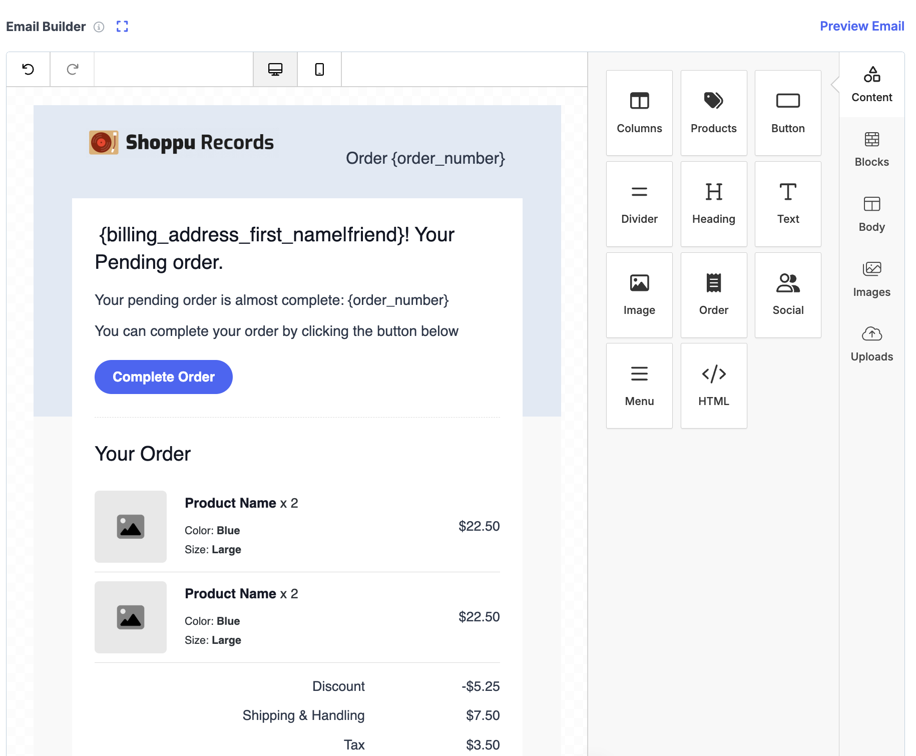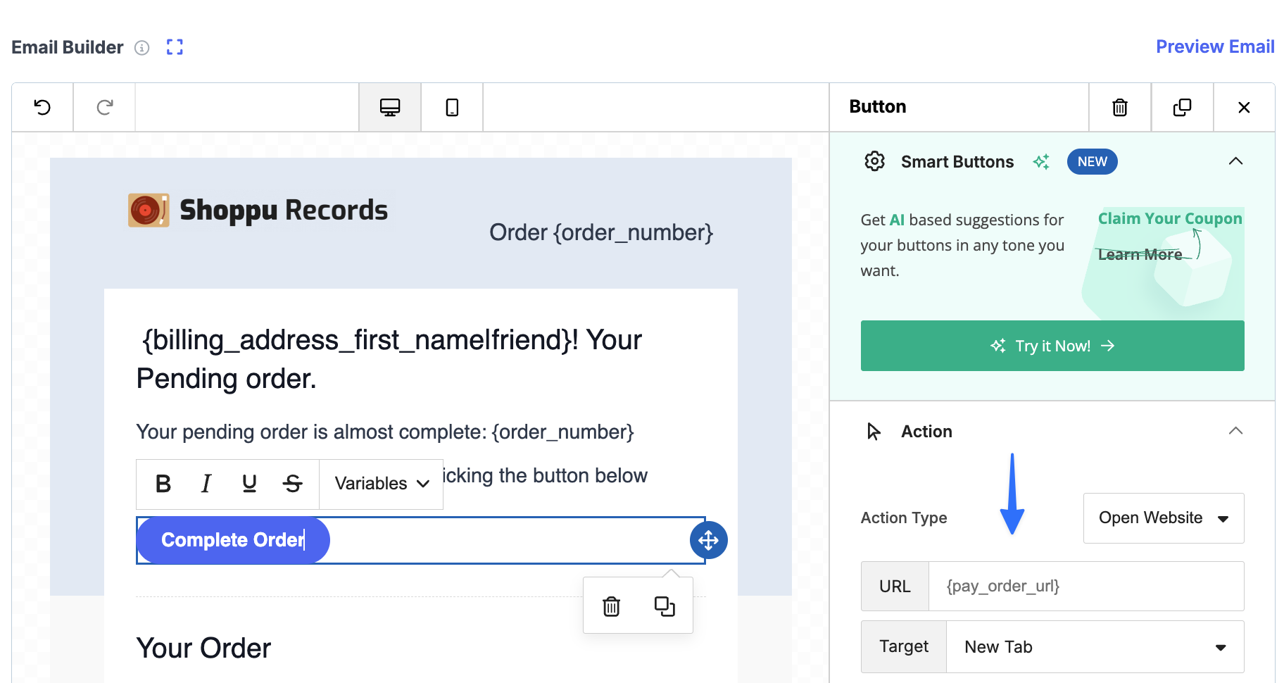 One thing we do recommend doing is using the {pay_order_url} variable to take customers straight to the payment page for completing their order.