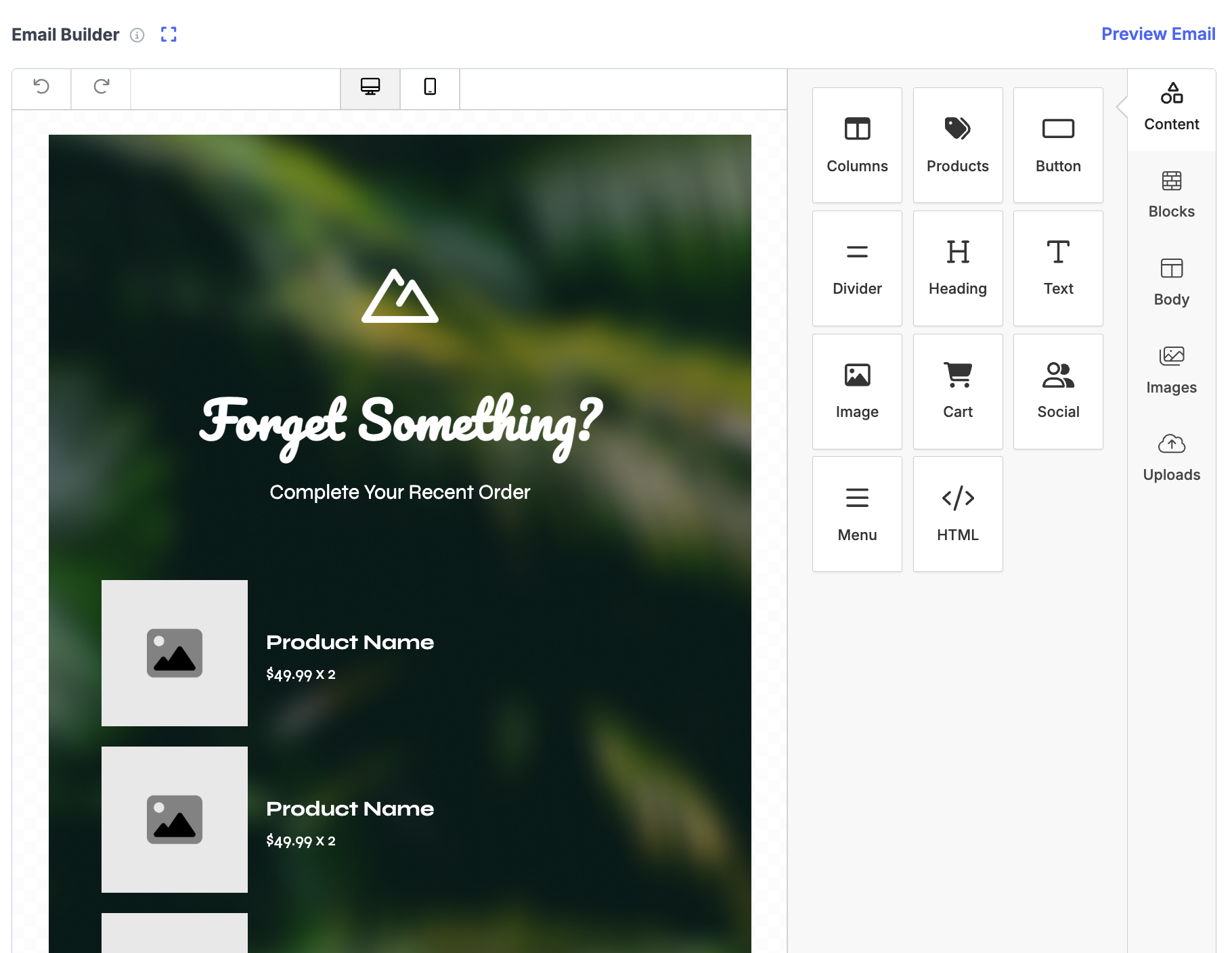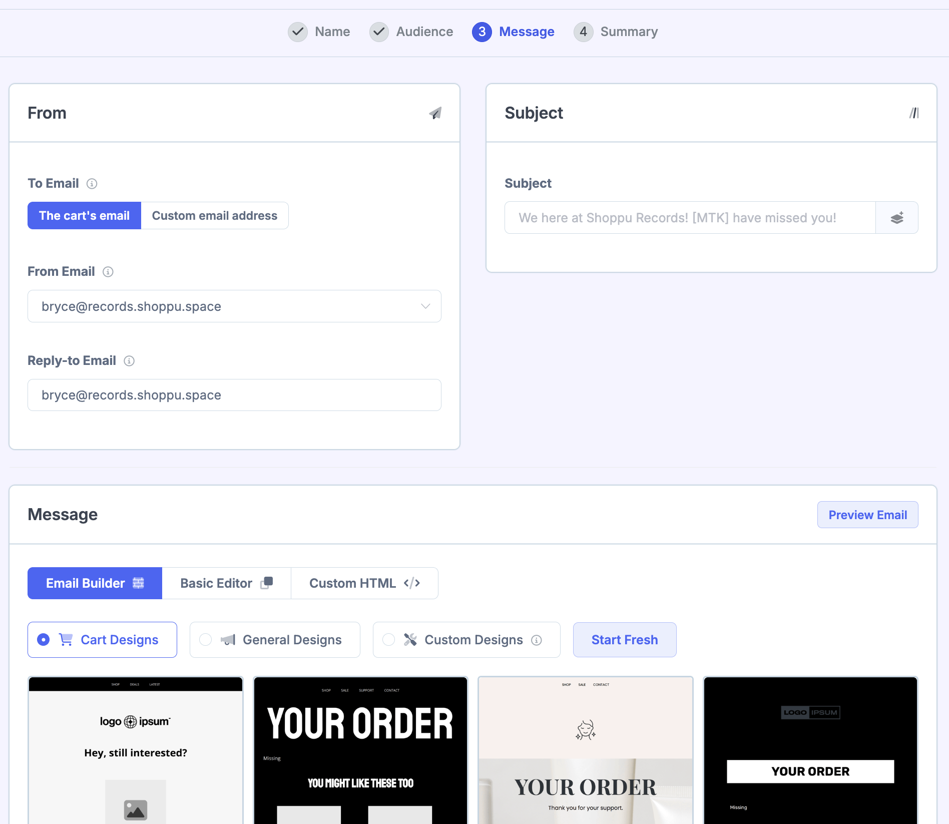 On the message page, you can compose the email that will be sent to abandoned carts. If you've never created an Engage automation before, you may want to check out the Engage - Building an Automation docs and video.
