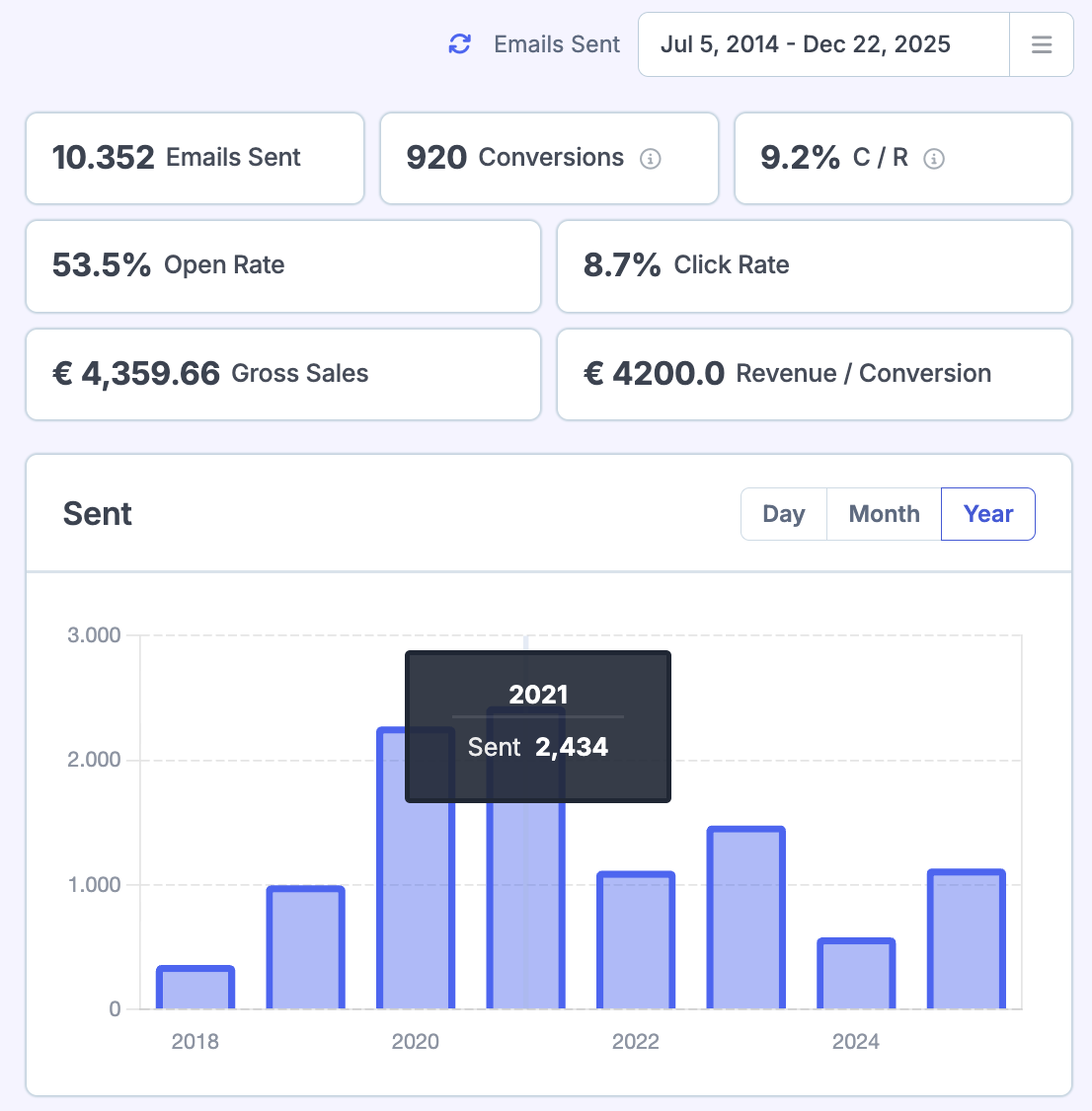 Each cart recovery email has its own stats page, where you can see the number of emails sent, what % are opened/clicked on, how many conversions (recoveries) you had from the email, and more.