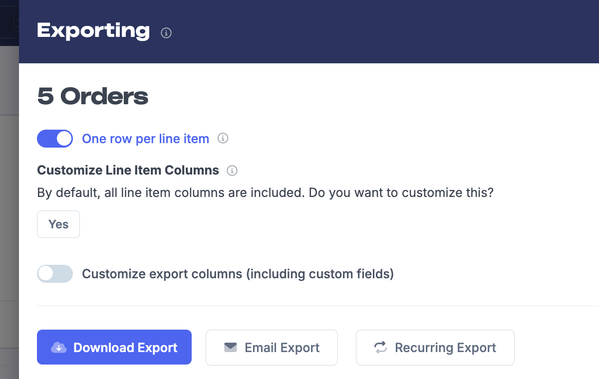 When you're exporting orders or subscriptions, check the one row per line item setting: