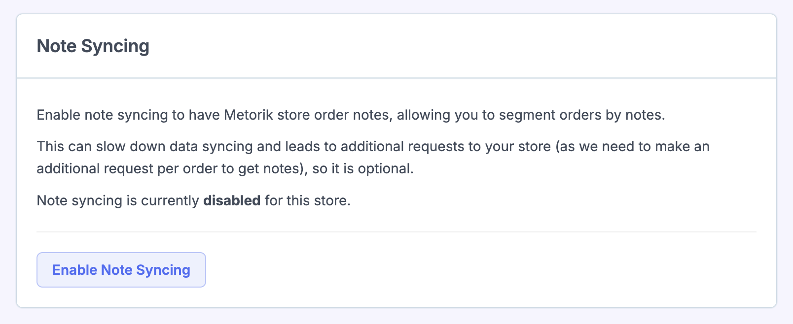 WooCommerce stores can also opt in to Note Syncing from the store connection settings in Metorik: