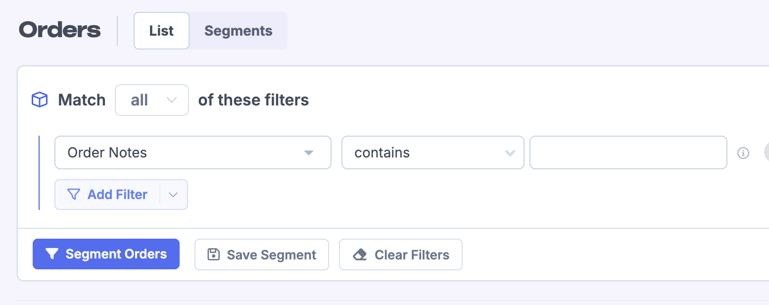 Once enabled, Metorik will automatically sync past order notes and future notes, allowing you to segment by them on the orders page: