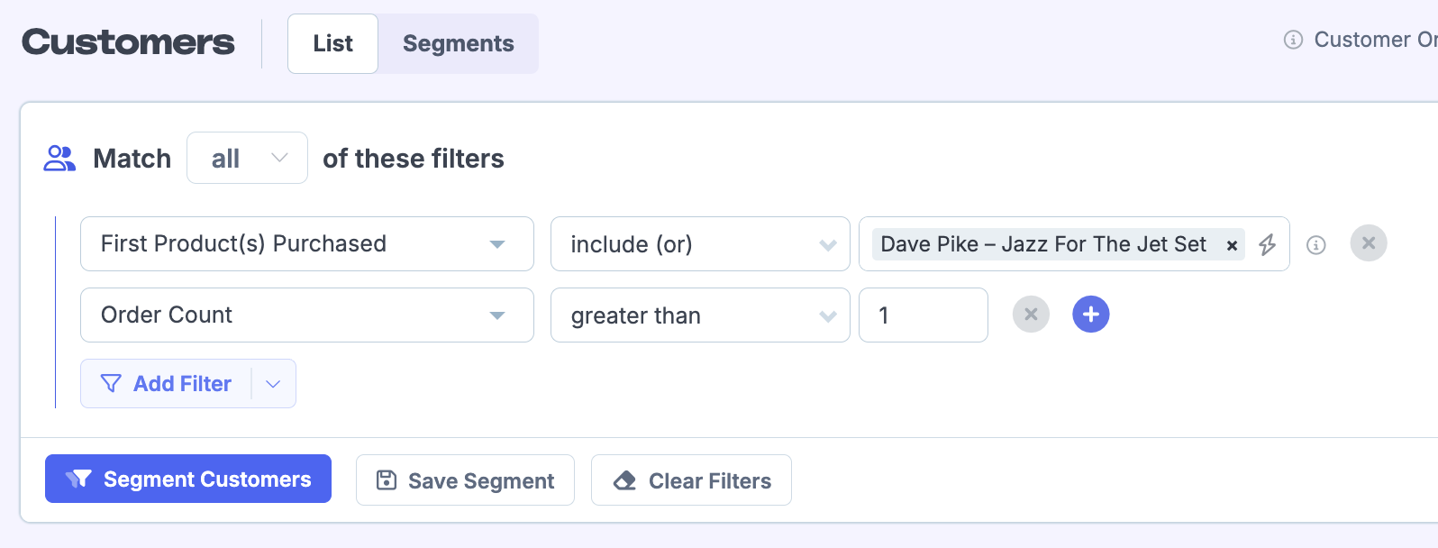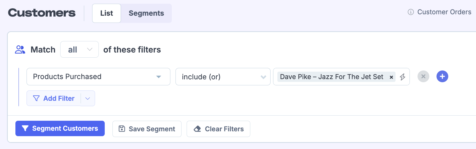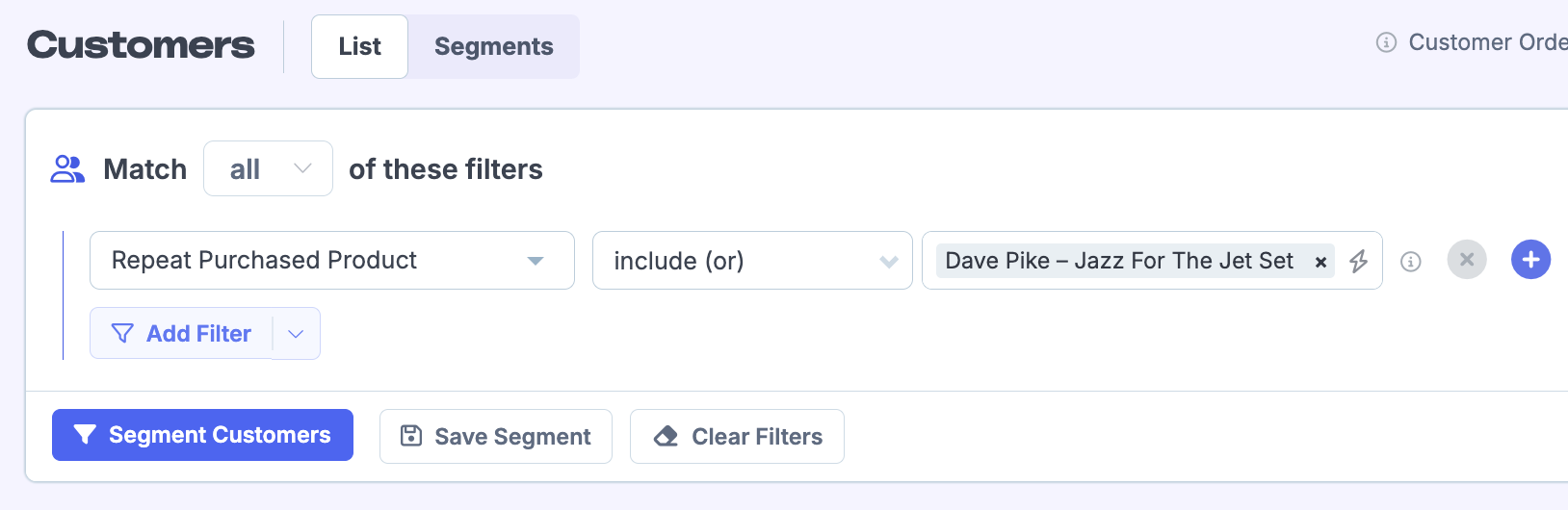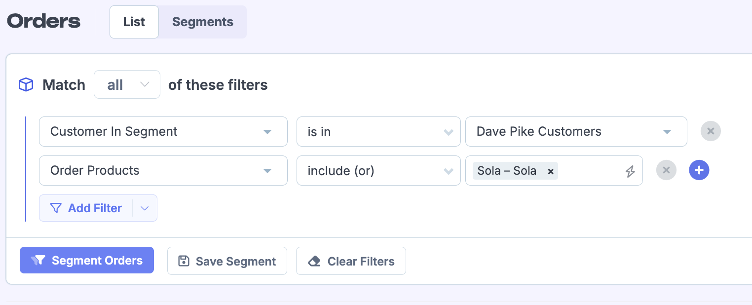 4. Head to your order segmenting page. Select the Customer In Segment filter, and select the custom segment we just saved.