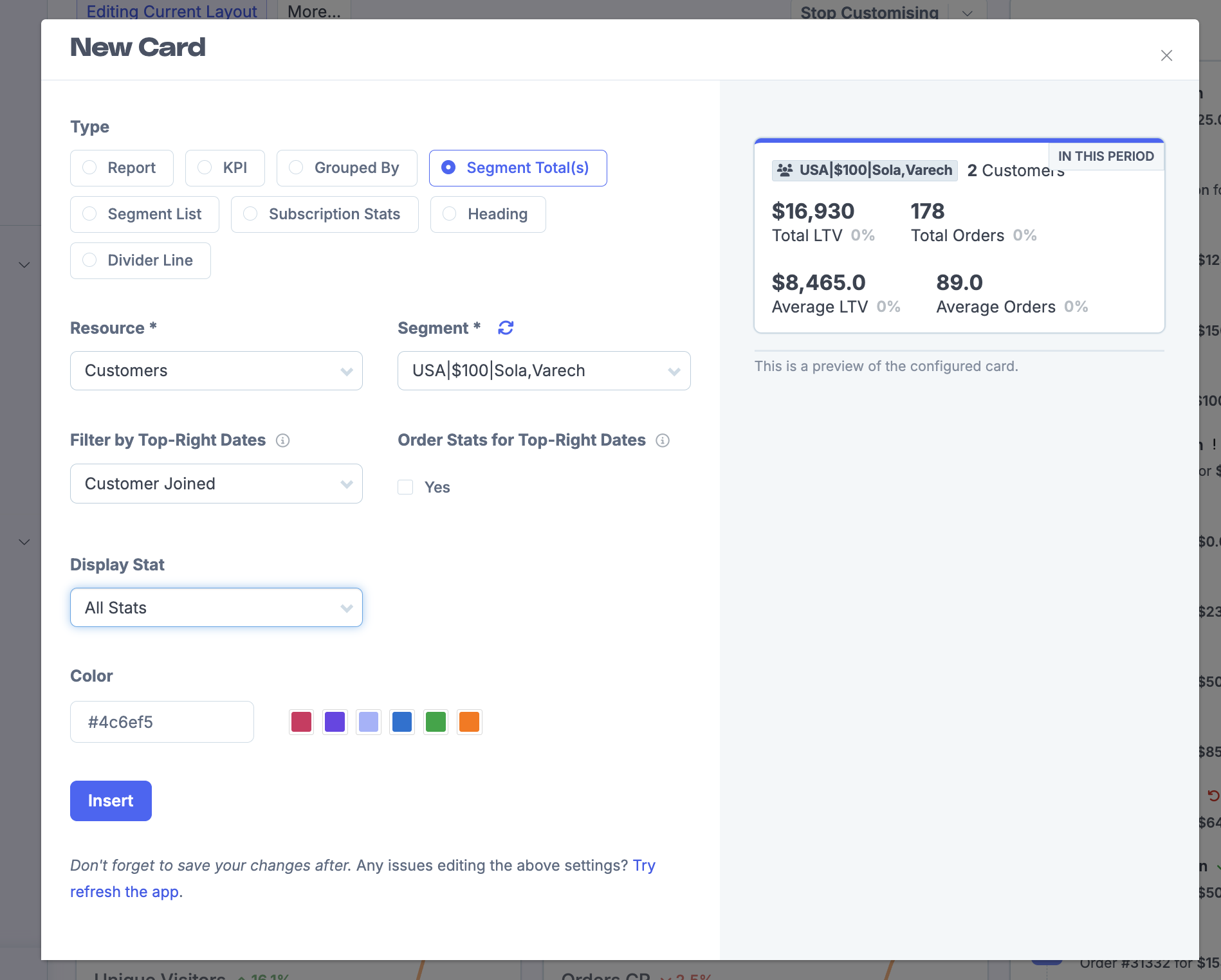 4a.Choose either segment total (KPIs and metrics) or segment list (list of orders, customers etc...). For this example, I'm going to choose the segment total.