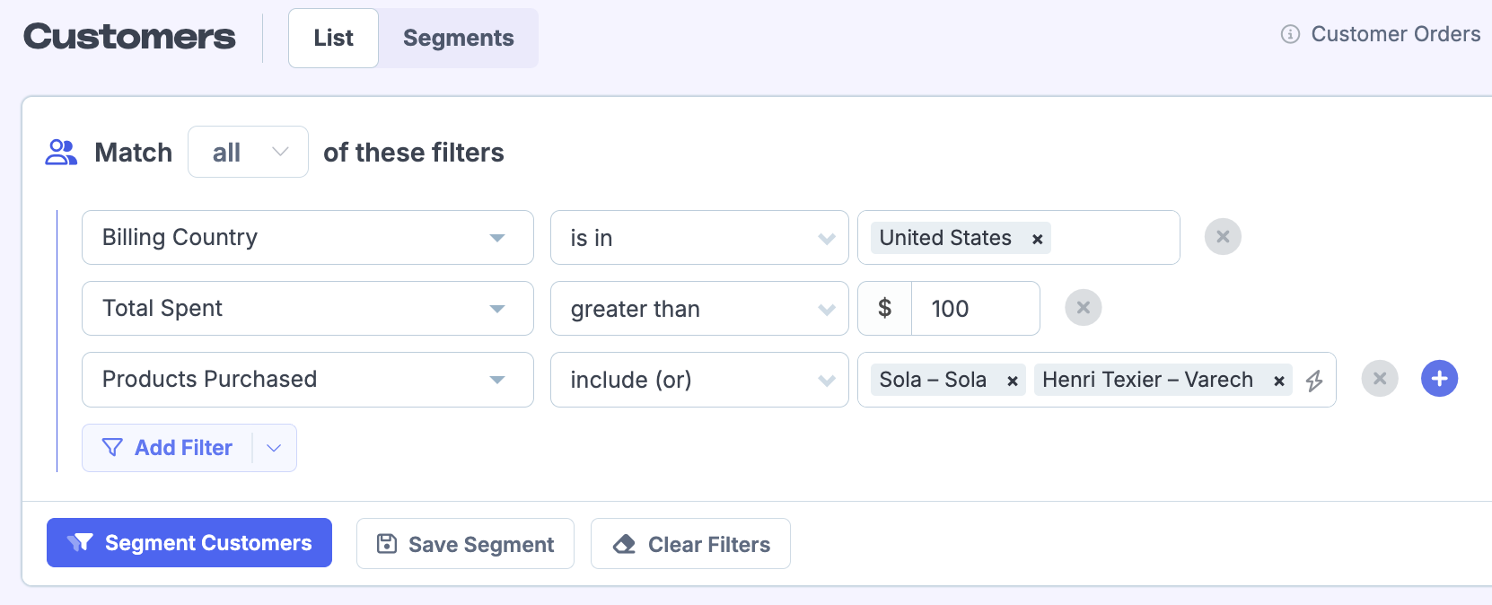 2. Stack as many filters as you need to achieve your desired custom segment. In this case, I want customers: