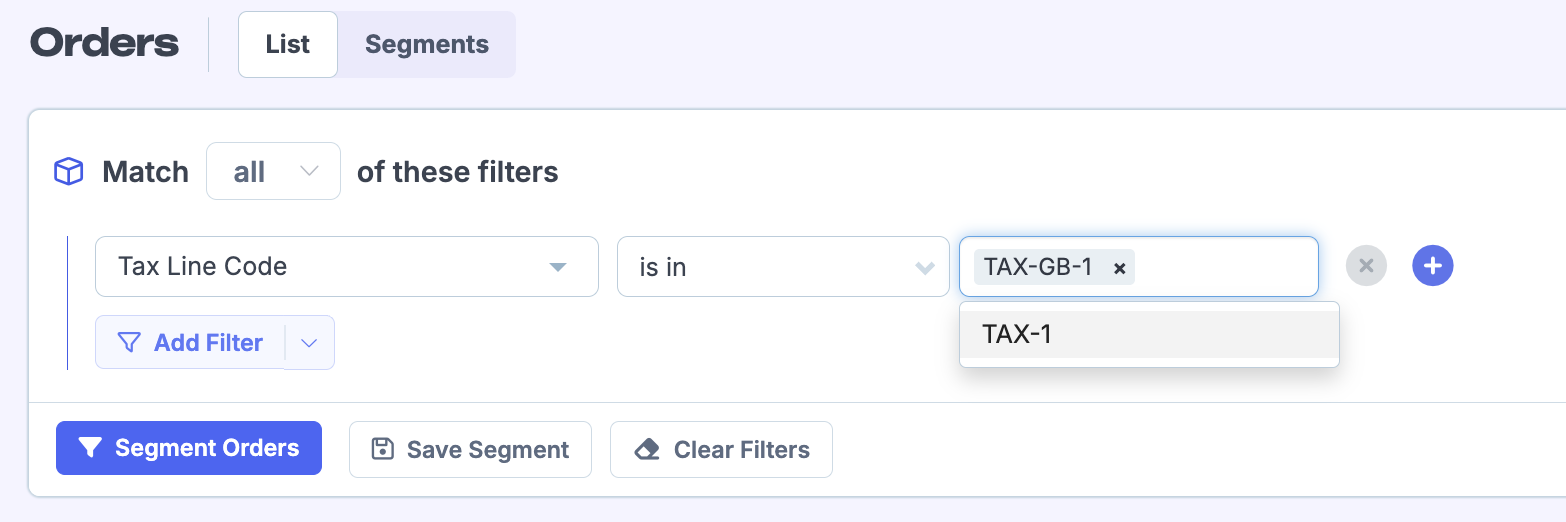 If you click on the number of orders in the tax report for a certain tax rate, it will automatically apply the necessary segment on the orders page to view the matching orders.