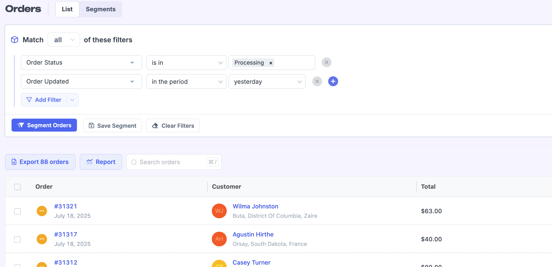 Head to your Metorik account to create the segment and export. Since we want processing orders for this example, let's head to our orders page. Here is my segment: