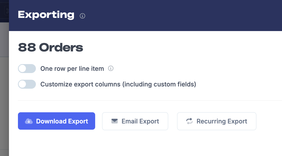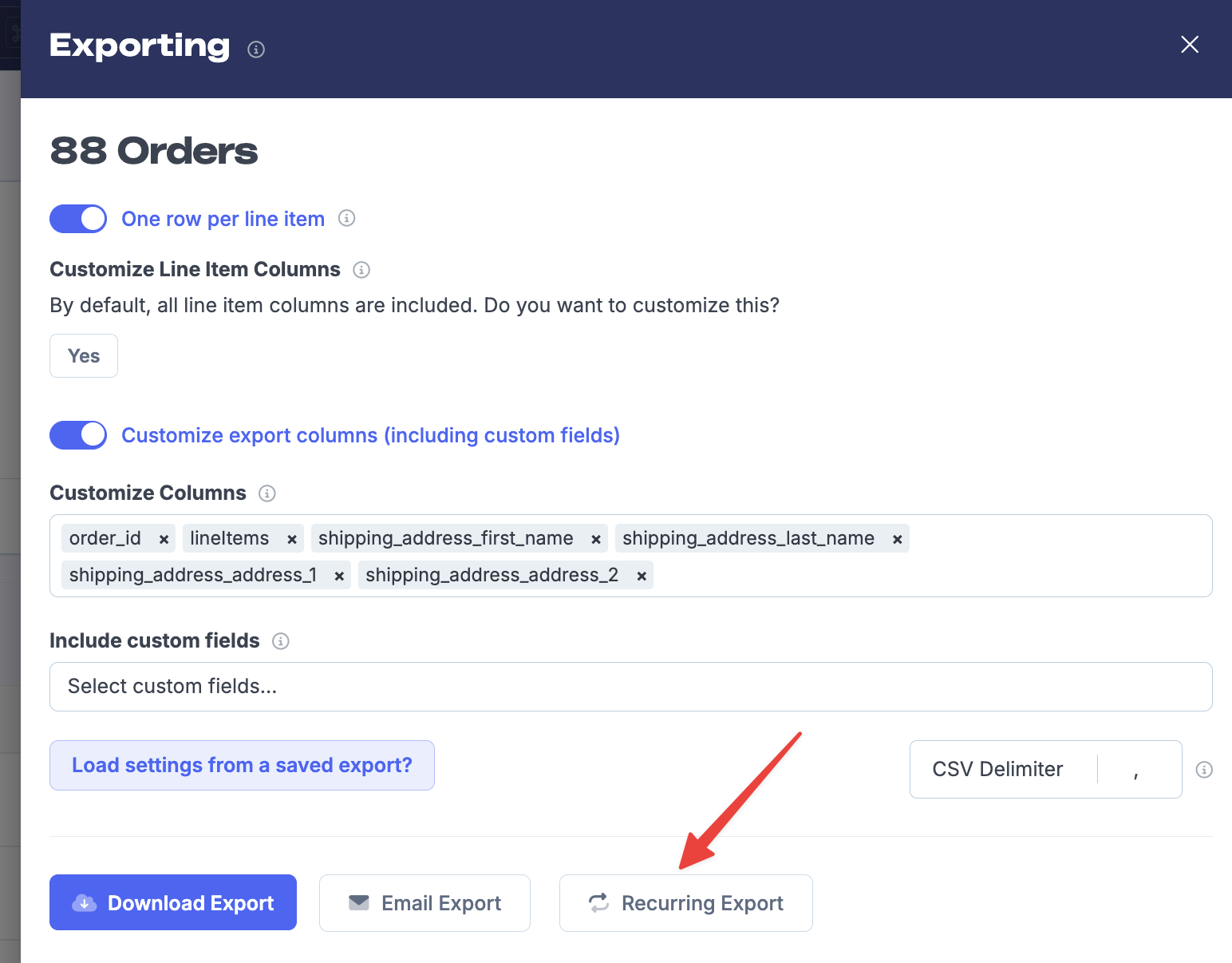 From here, you can customize which columns to include. I'm going to include the Order ID, Line Items, Shipping First Name, Shipping Last Name, Shipping Address 1, and Shipping Address 2: