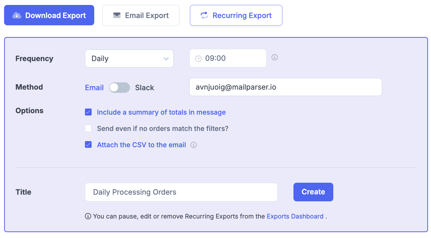 - The export sends to a Mailparser inbox, instead of your own email address.
