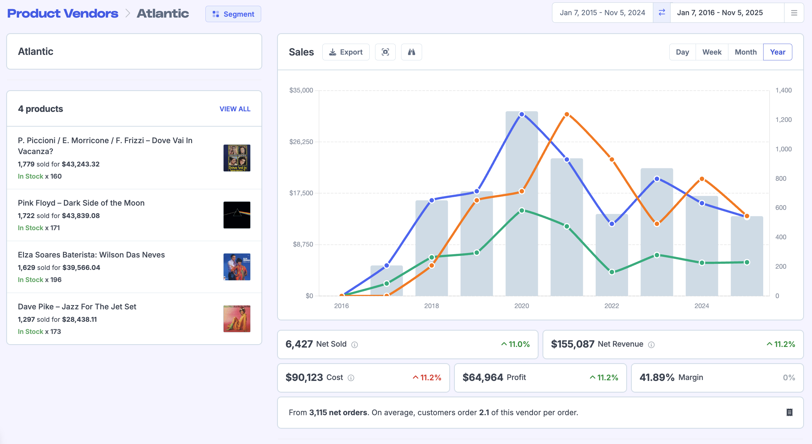 The Vendors Report will give a great overview of how your different vendors are performing. If you are also using our Costs Feature, you'll be able to see Profit and Margins data for each vendor.