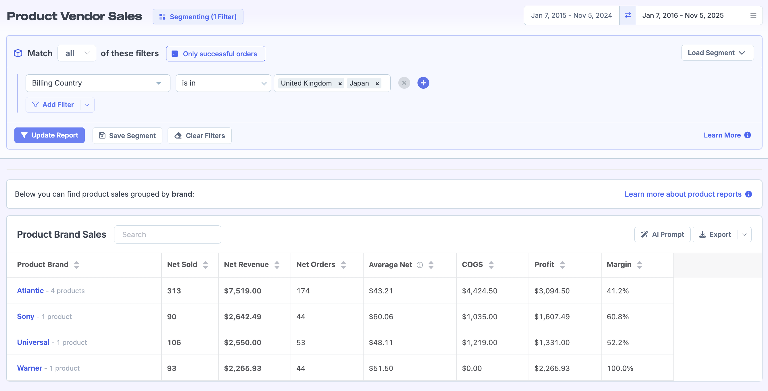You can use report segmenting to only view brand sales stats for certain orders. For example, limit orders to a certain country: