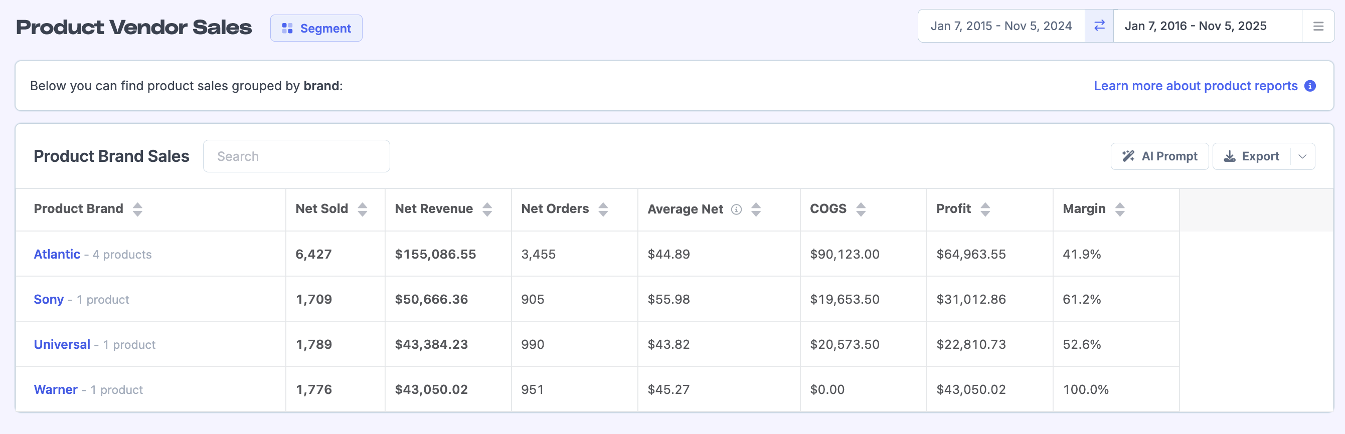 From a single vendor's report page, you can click view all next to the list of products to see matching products by vendor. Or alternatively, from the Product Sales page, you can filter on one or more of your different vendors, or exclude vendors from the list so you can get the exact breakdown you are looking for.