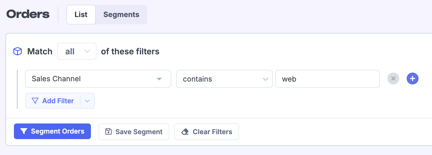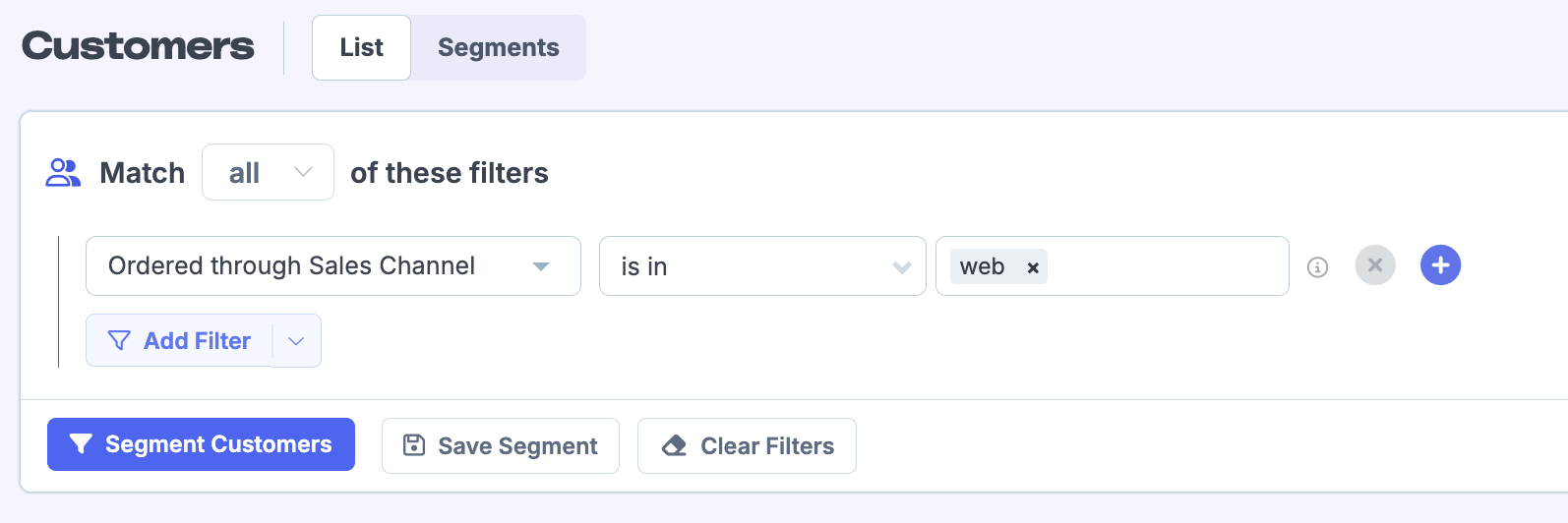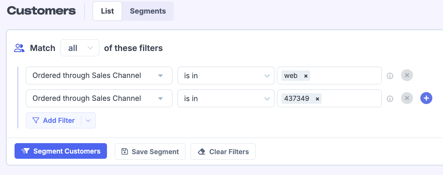 If you wanted to find all customers that have ordered through multiple specific sales channels, that's possible too by adding a second copy of the filter like so: