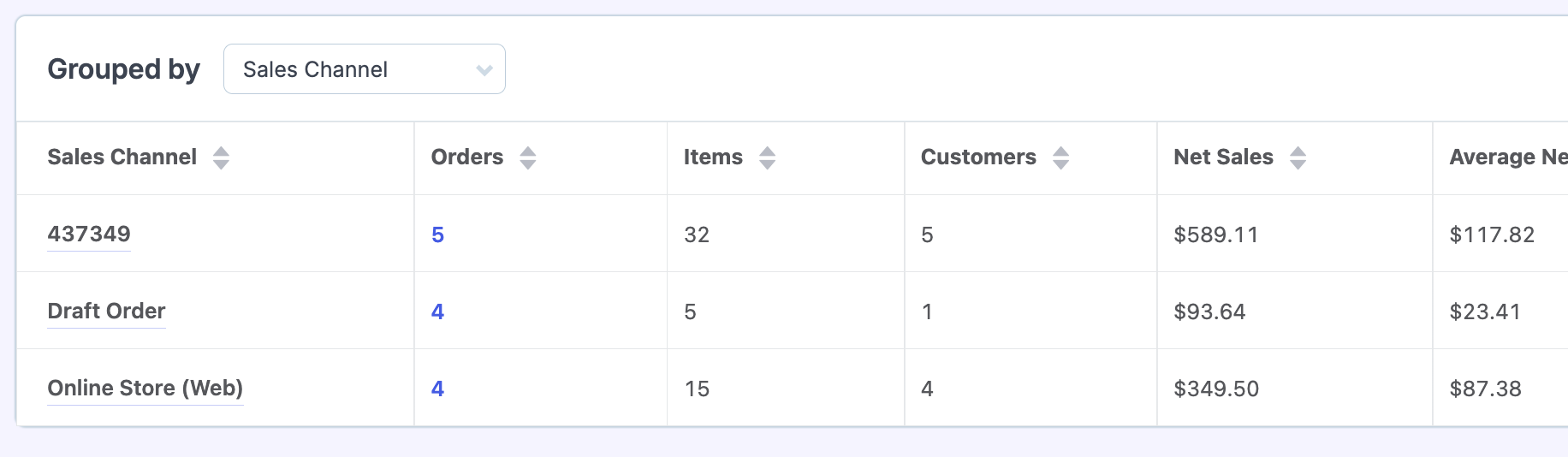 3. In the orders report, you'll find the orders grouped by sales channel report, which can be useful for seeing the sales for each channel in a certain period, along with some useful KPIs like the average order value for each channel: