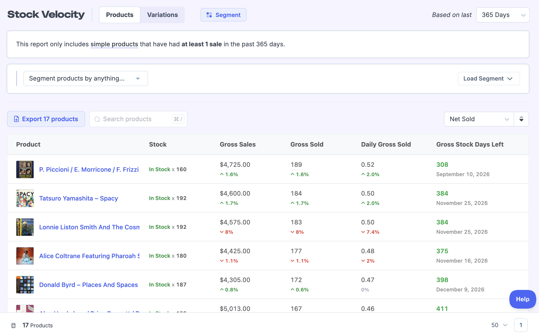 Inventory is used for segmenting products by inventory, and inventory-related reports like the total value of stock on hand, stock forecasting, and more.