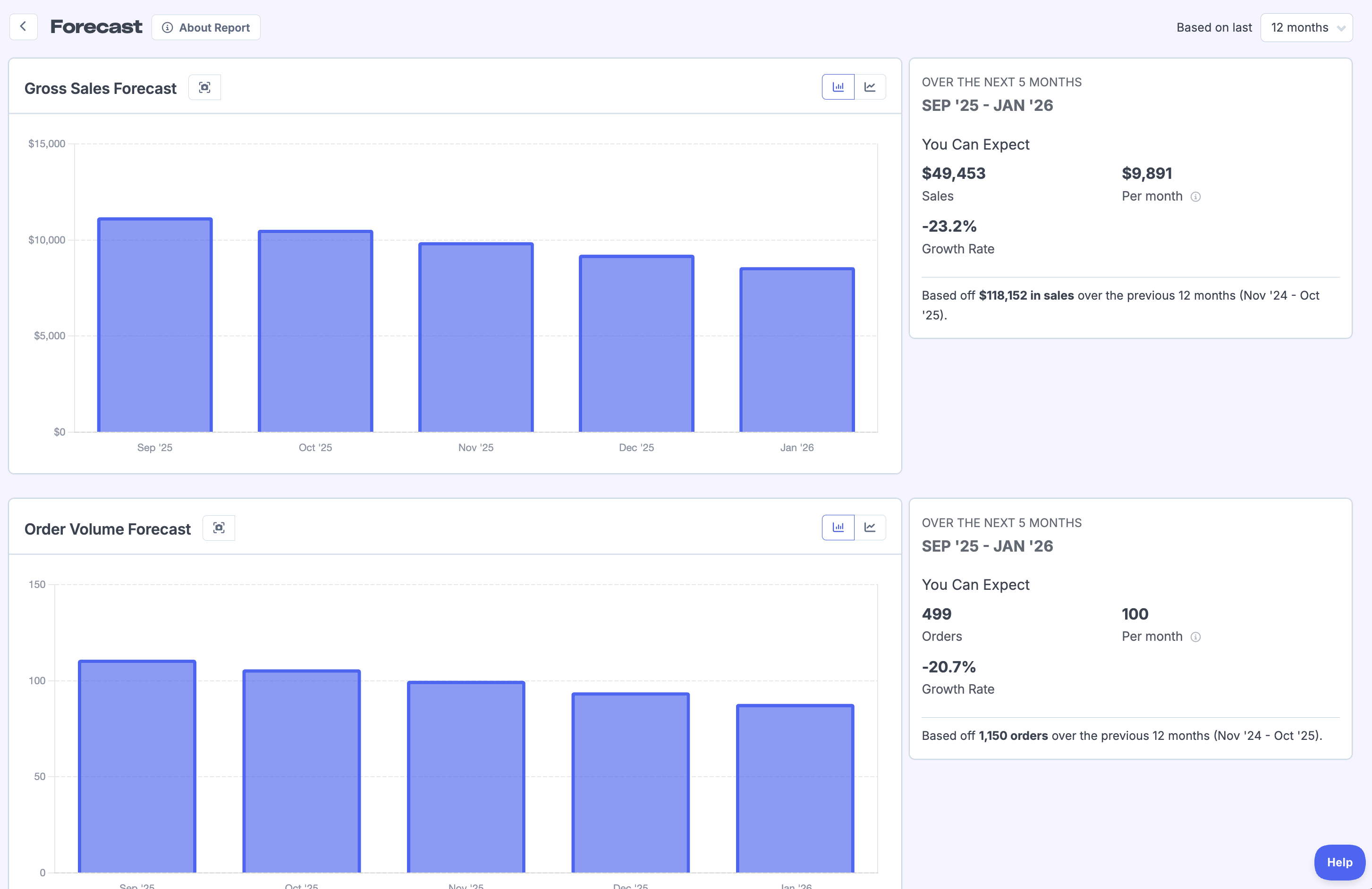 Metorik has a powerful forecasting system that allows you to forecast nearly any chart in the entire app. There is also a dedicated forecast reporting which allows you to quickly see sales, order, and customer forecasts.