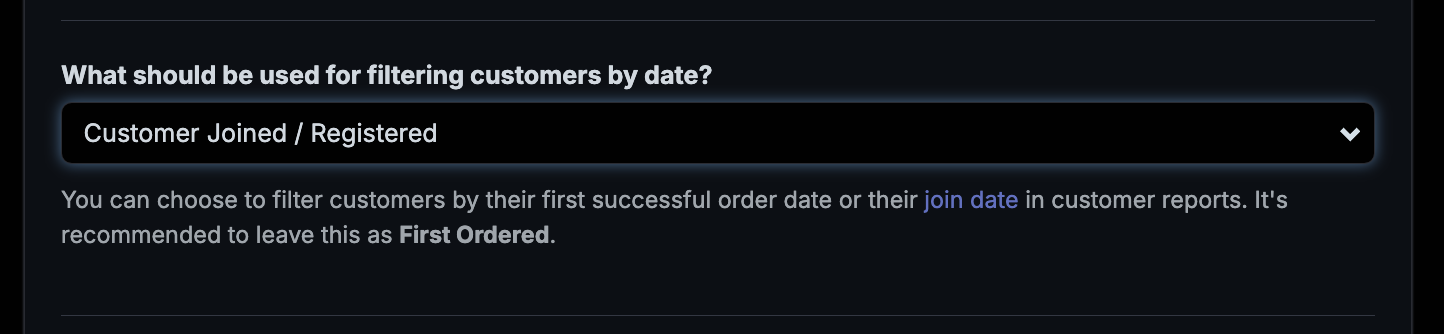 - Your date setting for filtering is set to Customer Joined / Registered and not First Ordered. (We recommend keeping this as First Ordered).