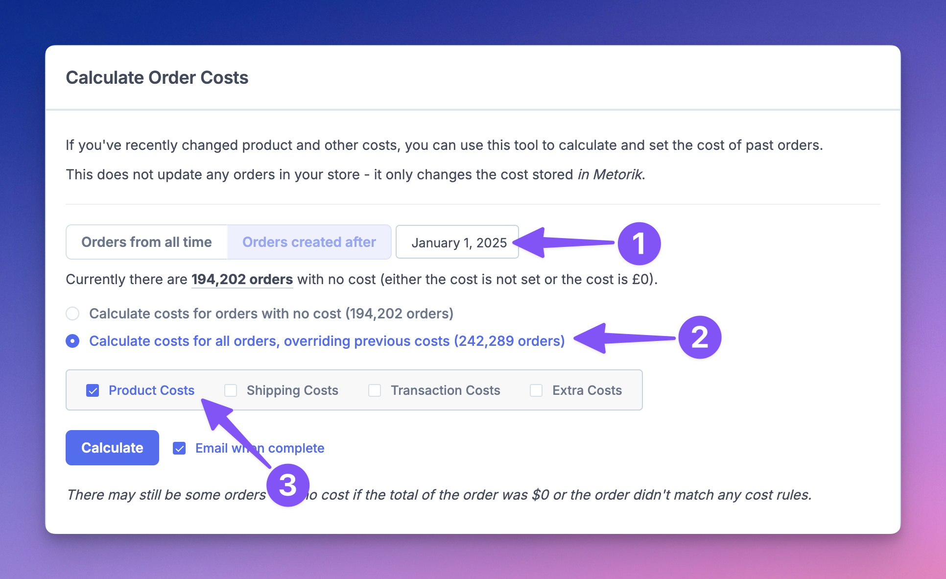 - Select to calculate costs for "All Orders"