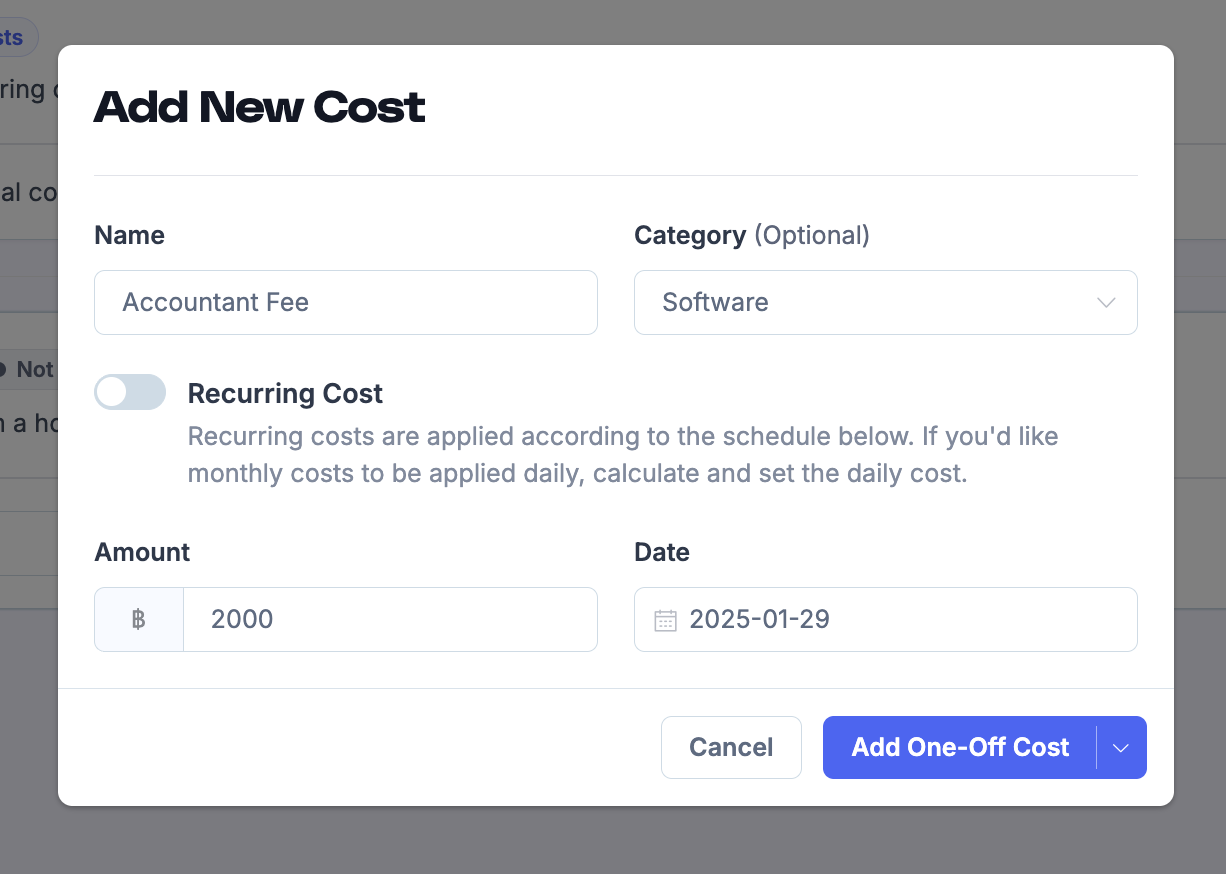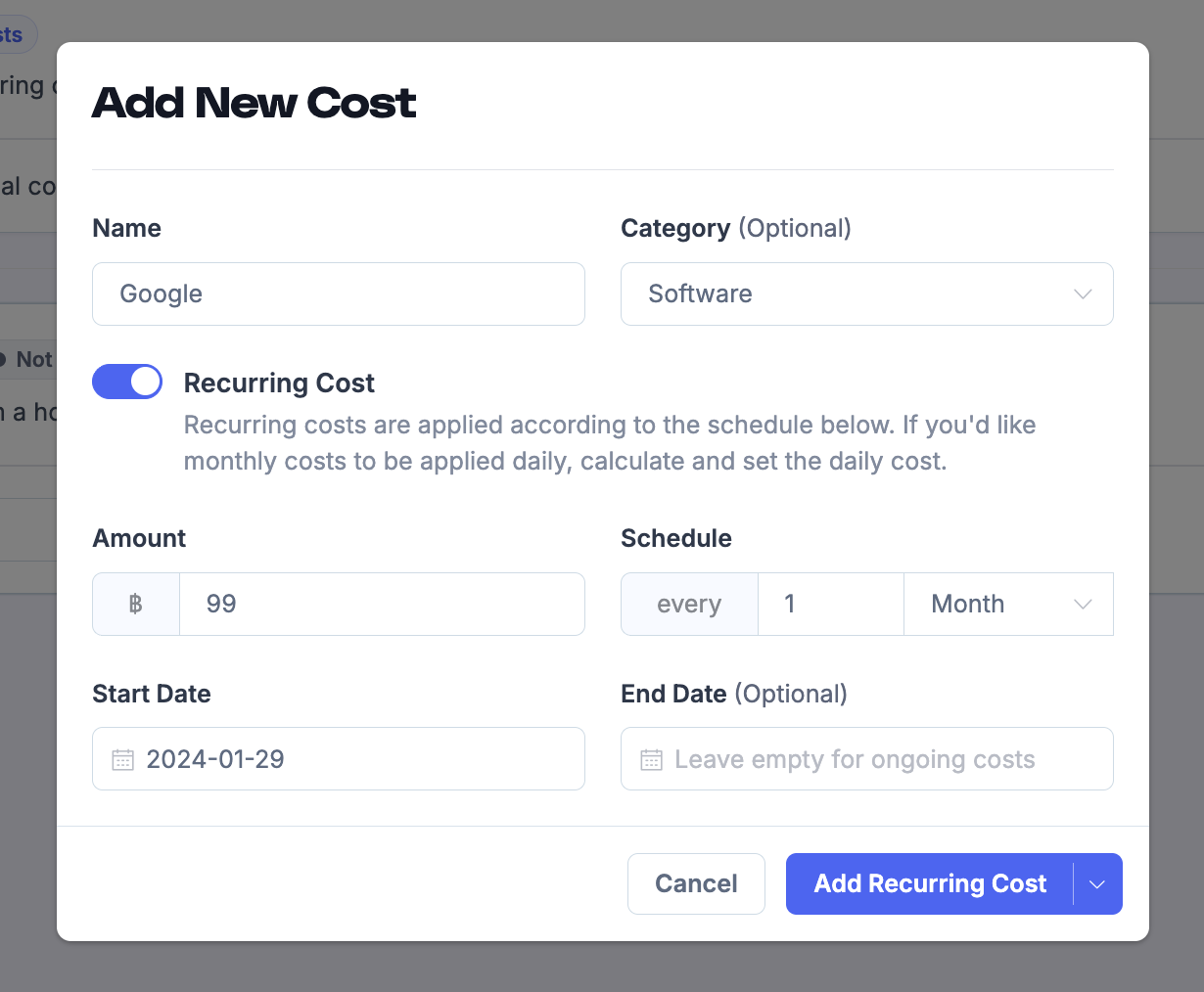 - (Optional) Set an End Date or leave blank for ongoing costs.