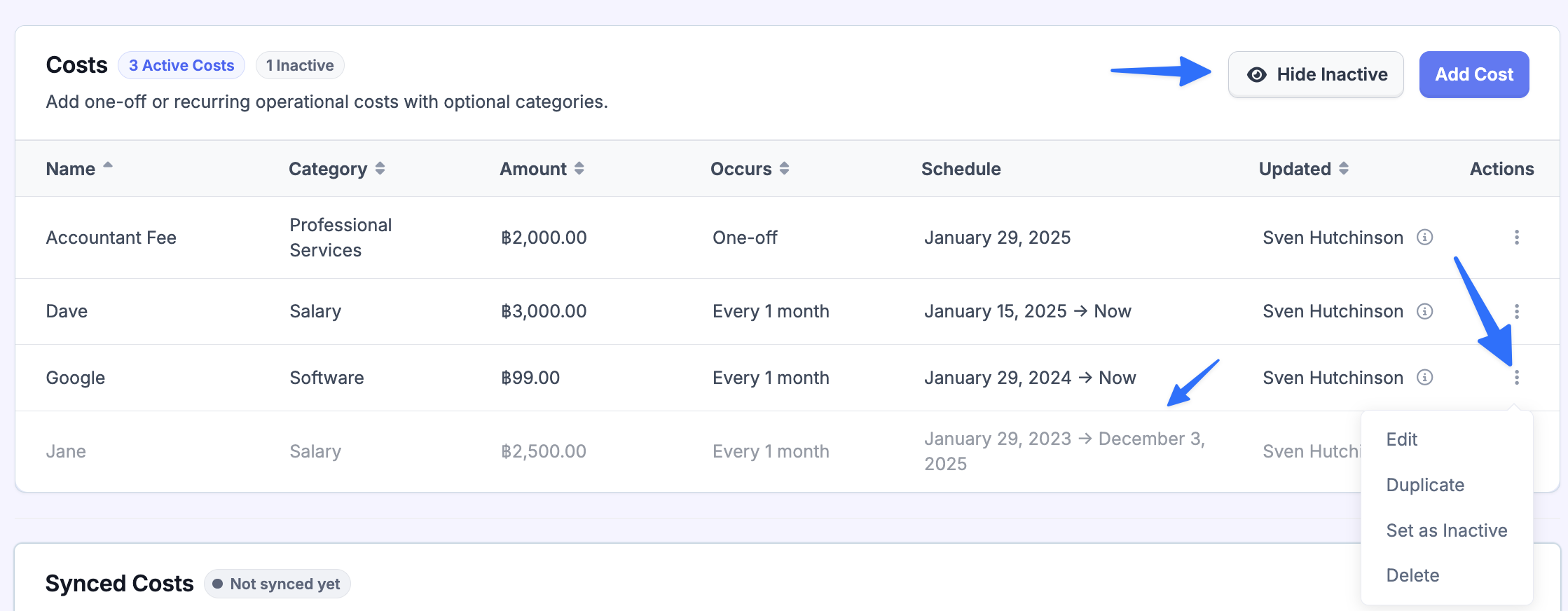 - Set as Inactive (stops future scheduled costs from tomorrow)