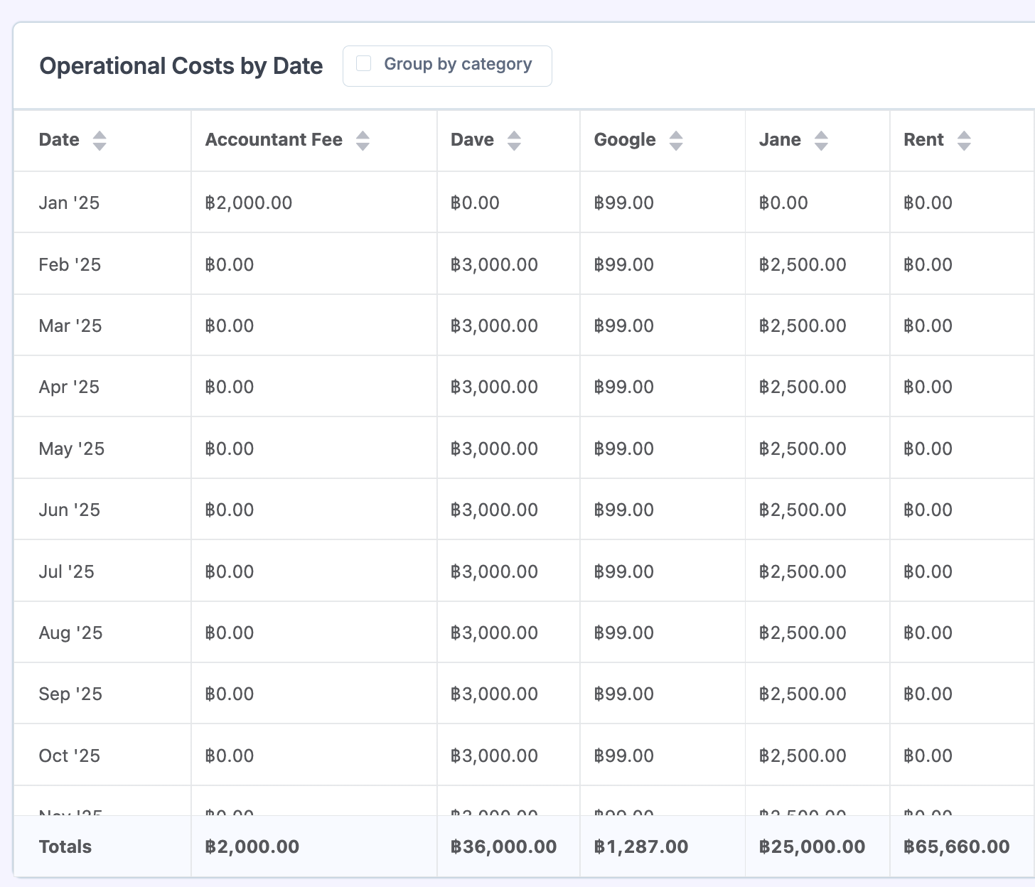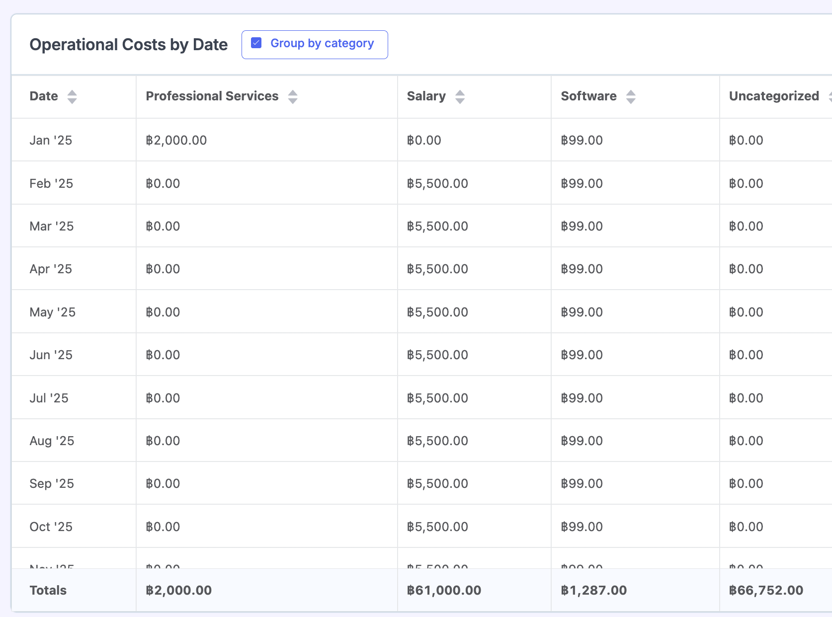 rent,salary,subscriptions,software. You can add as many as you like. ) - One row per date with the cost amount for each source
