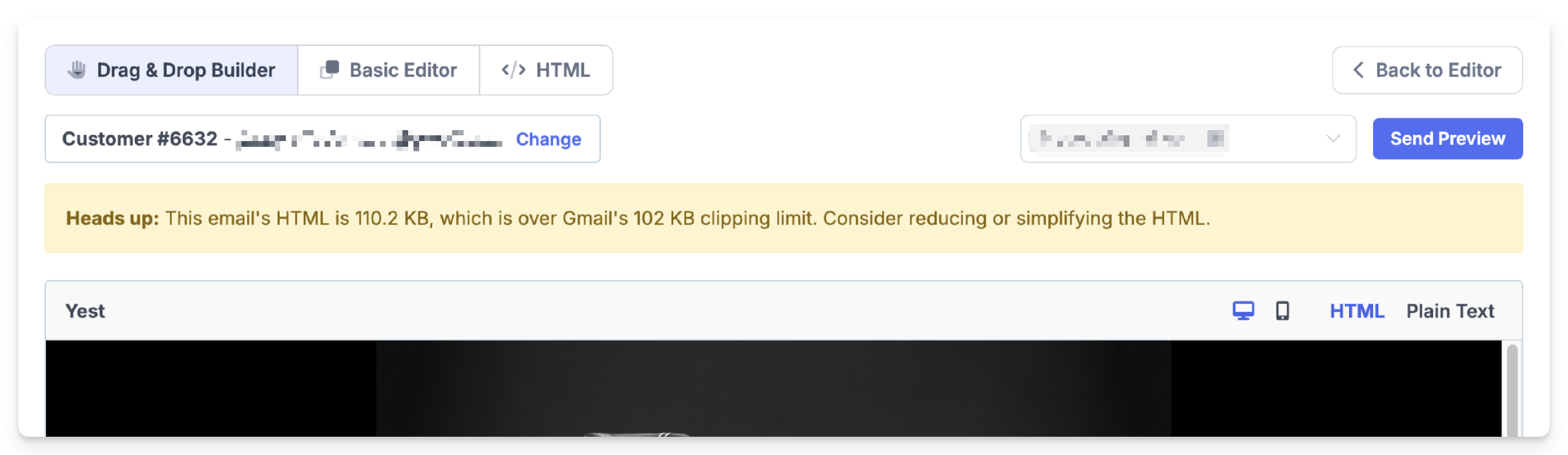 In Engage, Metorik will now automatically show you a warning when previewing the email, if we detect the HTML size to be over 102KB. You'll see this in a yellow alert at the top of the page, like so: