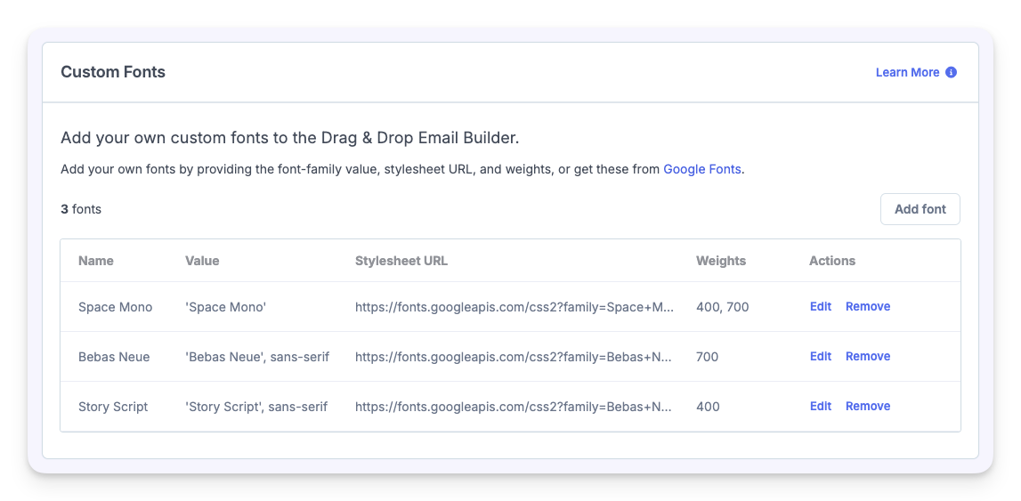 From the Custom Fonts settings page, you can Edit or Remove any font you've added. Removing a font won't affect emails that have already been sent, but it will no longer be available as an option in the email builder going forward.