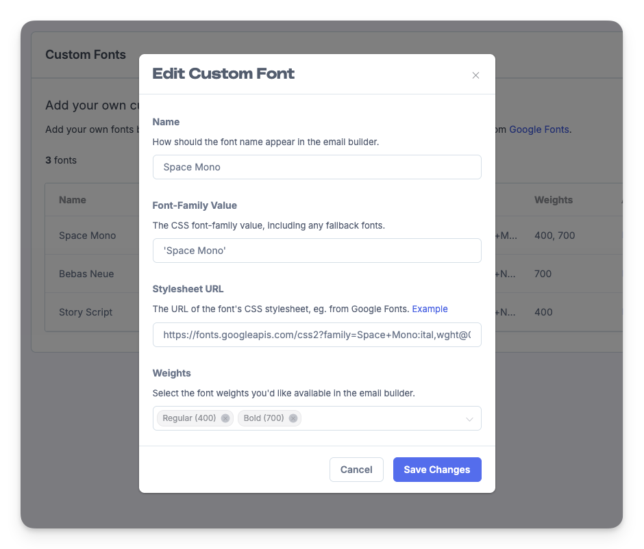 - Weights β The font weights you'd like available in the email builder (e.g. Regular 400, Bold 700).