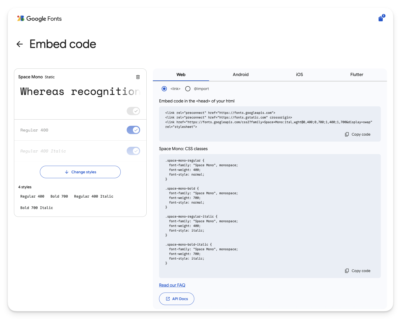 Choose the specific styles/weights you want to use in your emails (e.g. Regular 400, Bold 700) by clicking the "Get font" button and then "Get embed code".