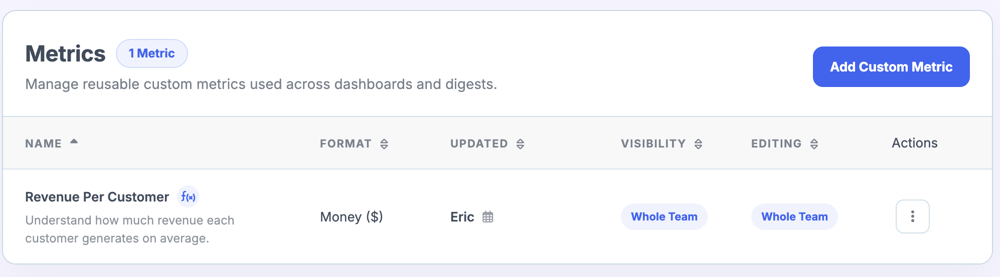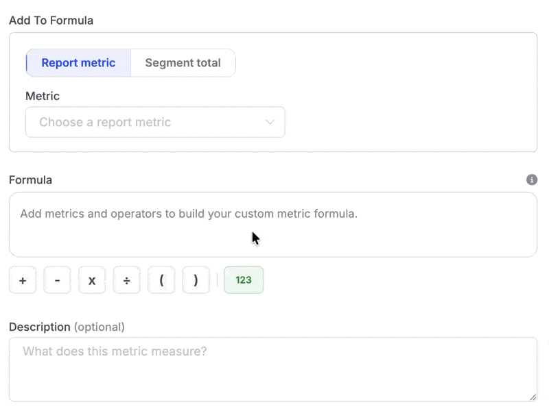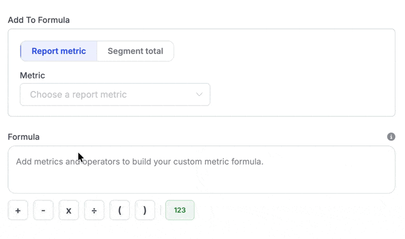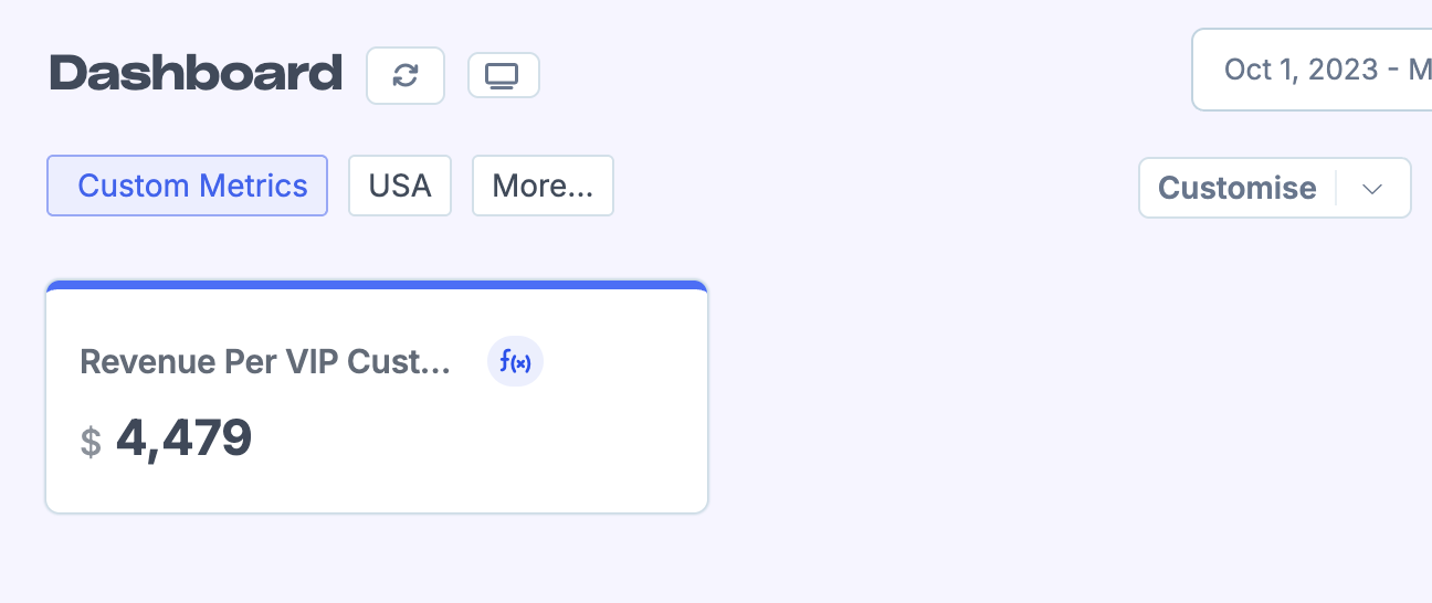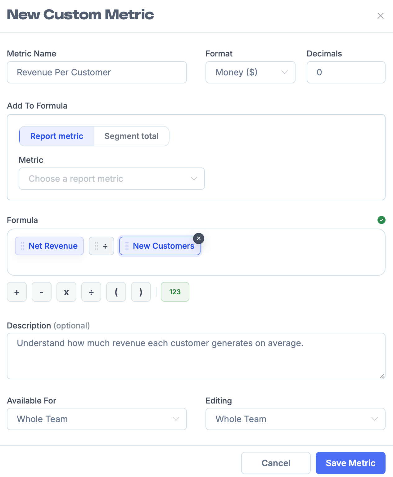 For example, let's say I wanted to create a Custom Metric called total revenue per customer. The formula for this would be Total Revenue / Total Customers.