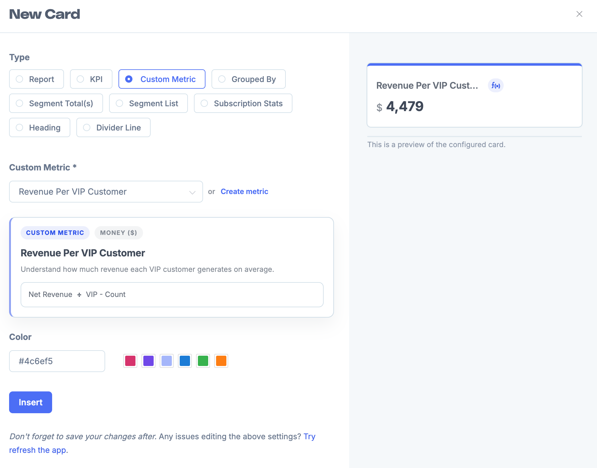 Custom Metrics let you combine existing metrics, KPIs, and even segment totals to create your own formulas. These can then be used across your dashboards, email digests, and even accessed via the Metorik API.
