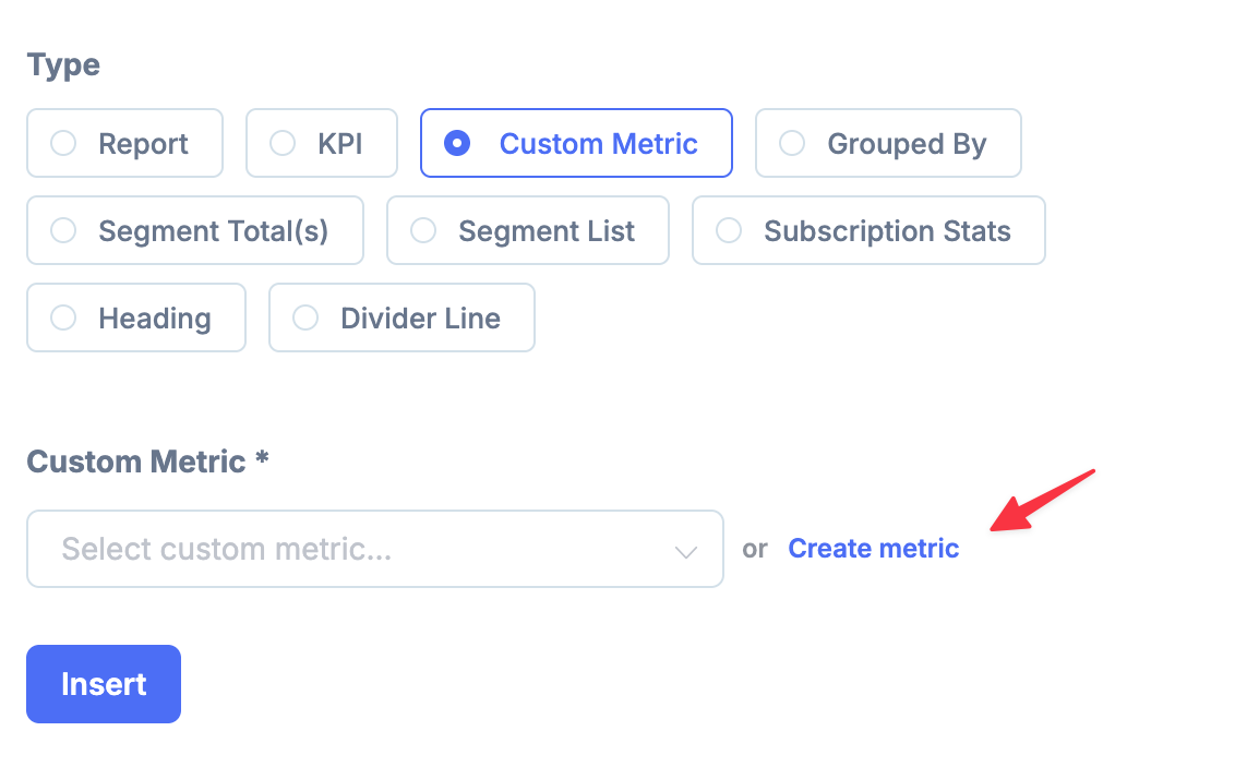 Once you have created a Custom Metric, you can add it to your dashboard or digest just like any other metric. Once you add a new card, instead select Custom Metric: