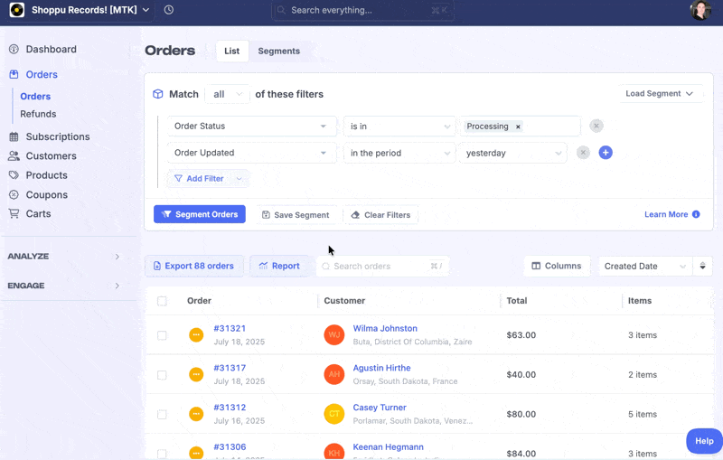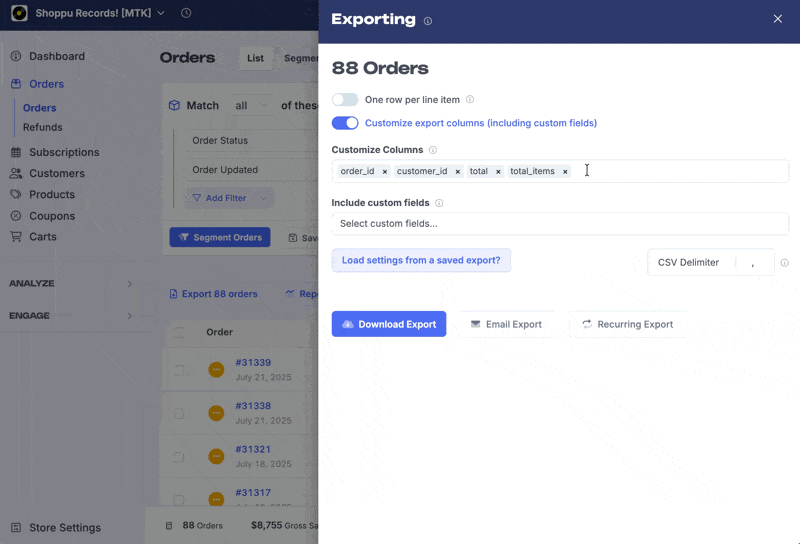 All of Metorik's 'resources' can be exported. These include Orders, Subscriptions (if your store uses WooCommerce Subscriptions), Customers, Products, Coupons and Carts. The process for exporting is almost the same across all resources.