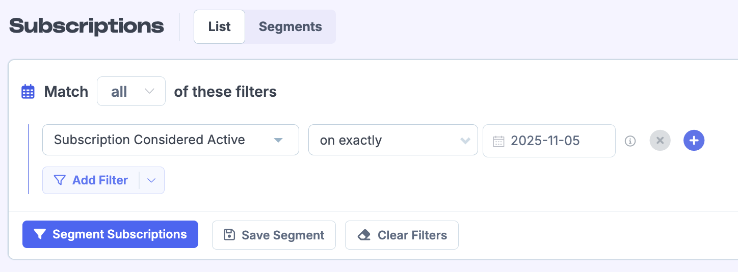 You may also find the subscriptions filter for Subscription Active on [date] useful: